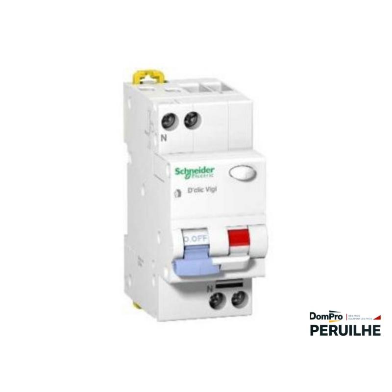 Ce disjoncteur différentiel Schneider Duoline D'clic Vigi équipe vos tableaux électriques en monophasé 230 VCA. Il coupe le courant à 16 ampères, avec une sensibilité de déclenchement à 30 mA, assurant la protection contre les fuites de courant sur site industriel ou chantier. Son pouvoir de coupure atteint 3000 A, avec une courbe C pour charges inductives.
