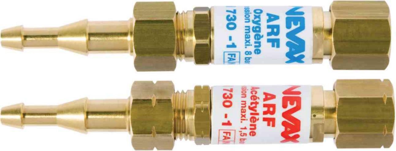 Paire de clapets antiretour pare-flamme OX/AD, diamètres 6,3 et 10 mm, sortie écrou 16 x 150. Protège détendeur et bouteilles contre les retours de flamme.