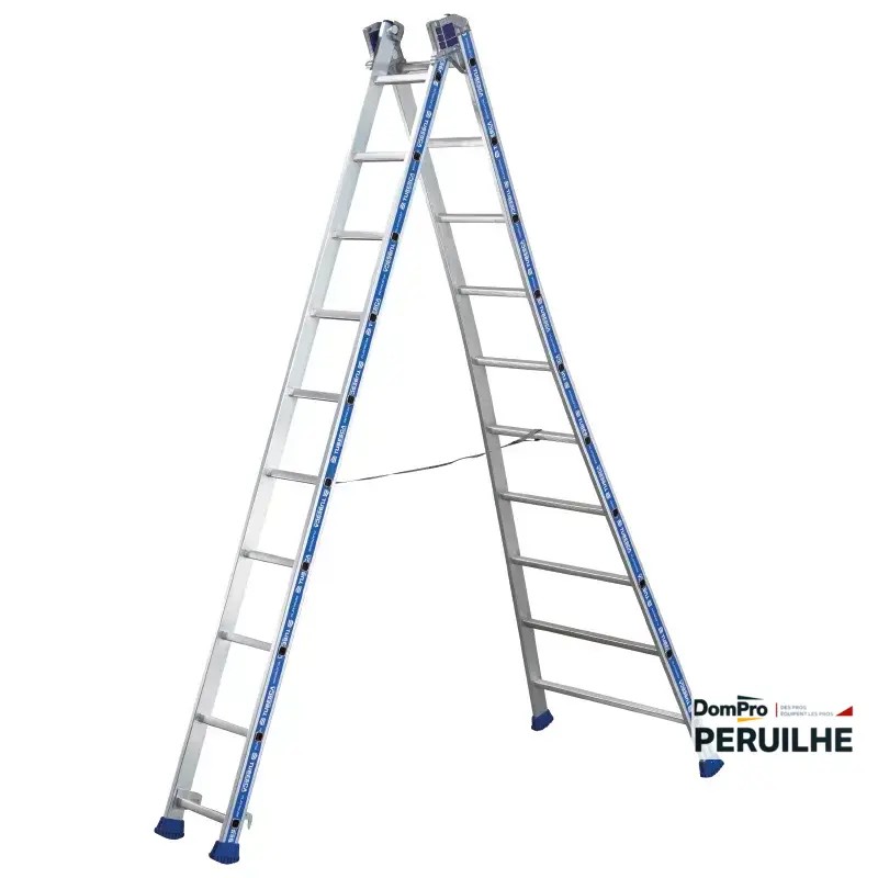 Échelle transformable 2 plans 2.92 m en mode échelle simple, 4.88 m en mode 2 plans. 2 x 10 marches aluminium robuste. Idéale pour accès en hauteur sur chantier, atelier, maintenance.