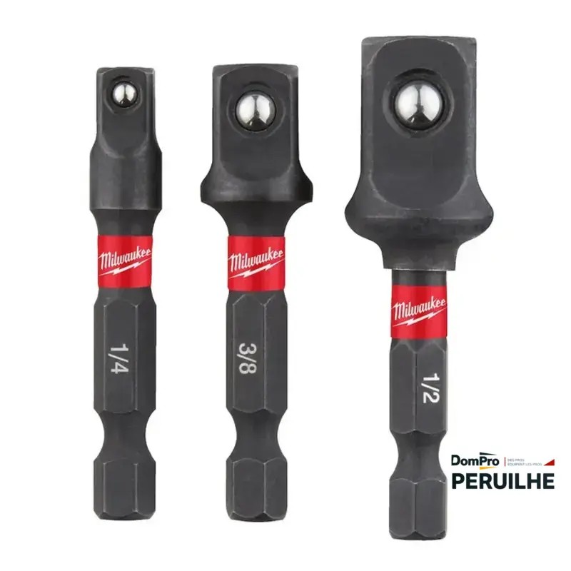 Set de 3 adaptateurs Milwaukee Shockwave pour visseuse à chocs 1/4" hex vers 1/4", 3/8" et 1/2" carré. Acier traité, longueur 50 mm. Résistants aux impacts forts.