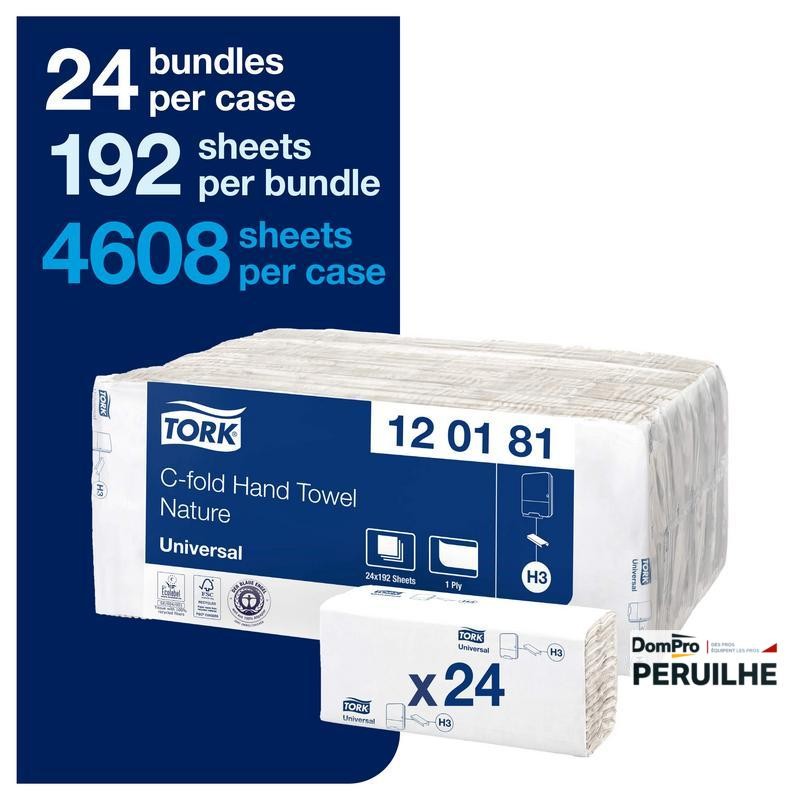 Essuie main plié Tork Universal, 192 feuilles par pack. Absorption rapide en atelier ou chantier. Compatible distributeurs standards.