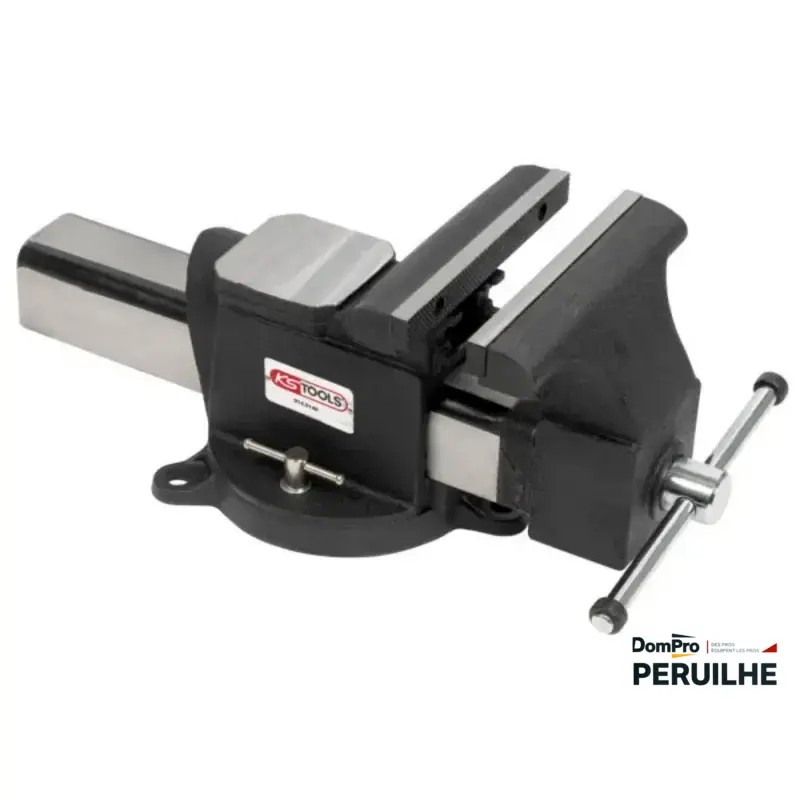 Étau KS Tools 200 mm, mors parallèles en acier trempé, base tournante. Ouverture 200 mm, poids 20,5 kg. Robuste pour atelier et maintenance industrielle.