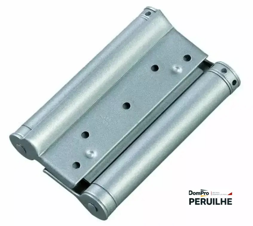 Charnière à ressort double action 150 mm pour portes battantes intérieures de 35 à 40 mm d'épaisseur. Axe inox Ø16 mm, capacité 35-40 kg pour 2 charnières, finition époxy argent.