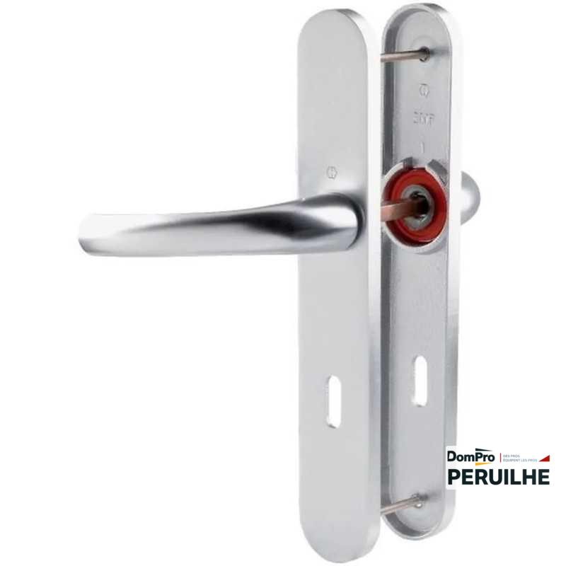 Ensemble sur plaque grande modèle TOKYO finition argent, adapté aux portes intérieures entre 38 et 47 mm d'épaisseur. Entraxe de fixation 195 mm, carré tige de 7 mm pour une fixation solide. Ce produit combine robustesse et légèreté pour un usage pérenne en bâtiments publics et bureaux.
