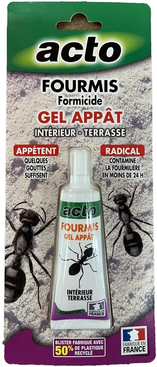 Gel appât Acto 30g pour élimination totale des fourmilières en 24h. Usage intérieur et terrasse. Action par ingestion avec transfert au nid.