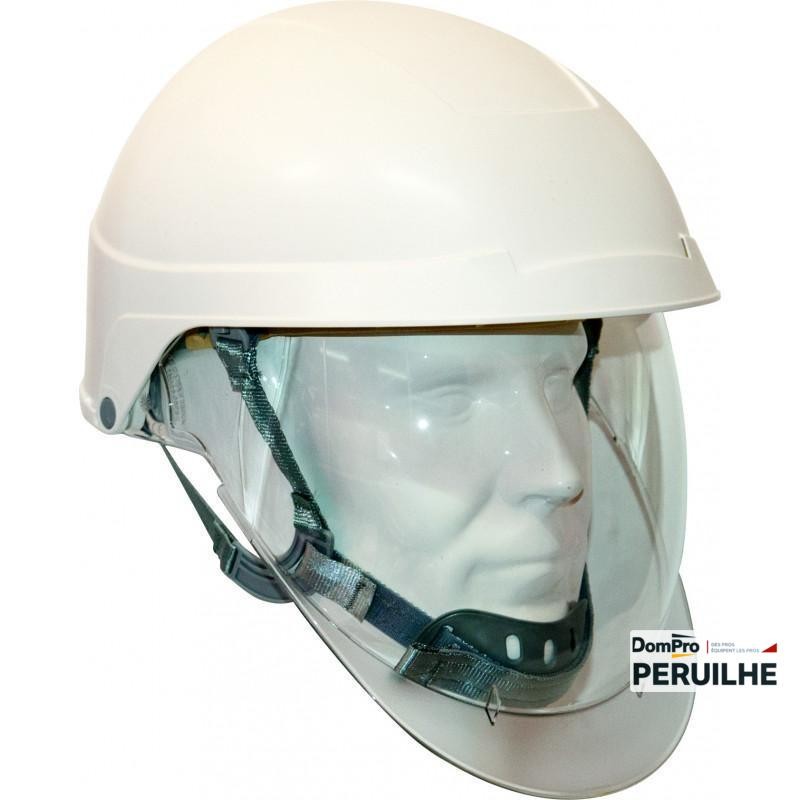 Casque blanc avec calotte ABS moulée sous pression, équipé d’un écran facial en polycarbonate de 330 x 200 mm, épaisseur 2,2 mm, anti-buée et anti-rayures. Jugulaire 4 points avec mentonnière assure un maintien sécurisé. Réglage possible de 49 à 63 cm grâce au serre-nuque à crémaillère.
