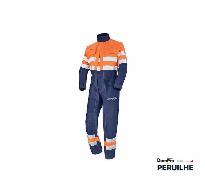 Combinaison haute visibilité CEPOVETT en tissu polyester-coton 300 g/m², 2 zips, classe 3 EN ISO 20471. Tailles 36-70. Lavage machine. Protection visible de jour comme de nuit.