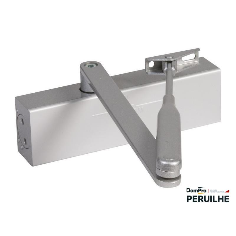 Ce ferme-porte associe technologie pignon-crémaillère et bras compas. La vitesse de fermeture, l'à-coup final et le frein à l'ouverture se règlent par vis pointeau en face avant pour un ajustement fin. Le clapet de surpression anti-vandalisme protège le vérin hydraulique. Le montage est universel : côté paumelle ou opposé, sur vantail ou dormant. La finition est argenté, adaptée aux menuiseries extérieures.