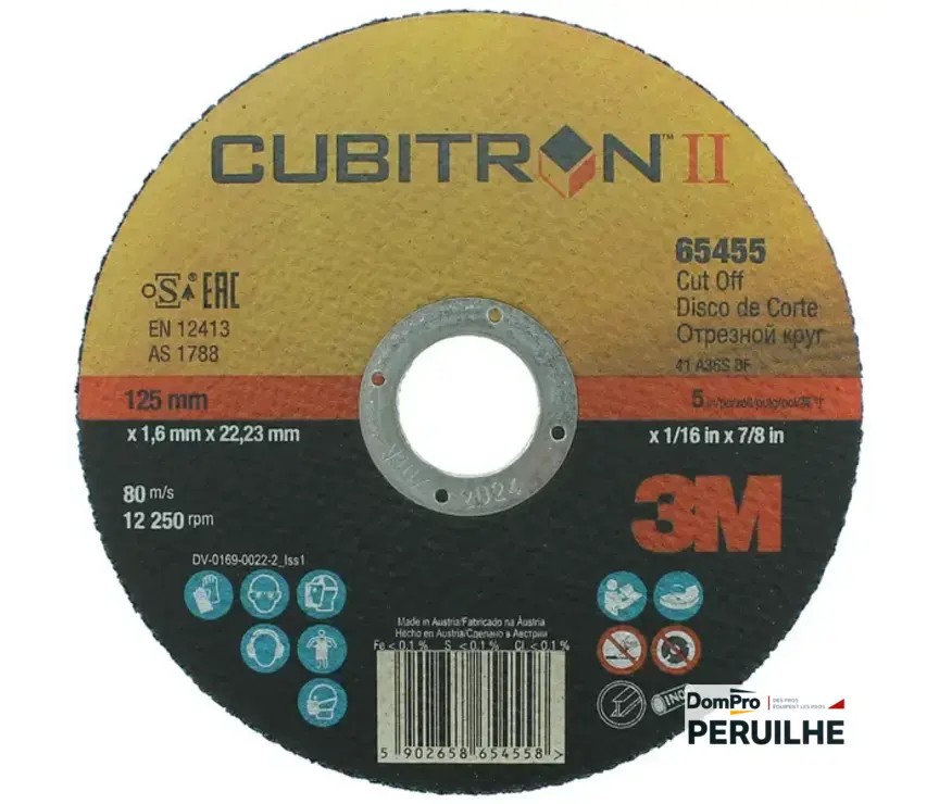 Disque de tronçonnage Cubitron II 125 mm x 1,6 mm, alésage 22,23 mm. Utilisation main levée sur meuleuse angle électrique et pneumatique, vitesse max 80 m/s.